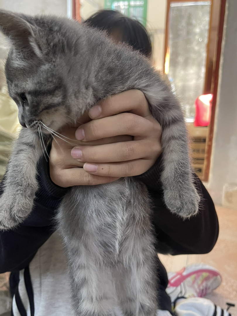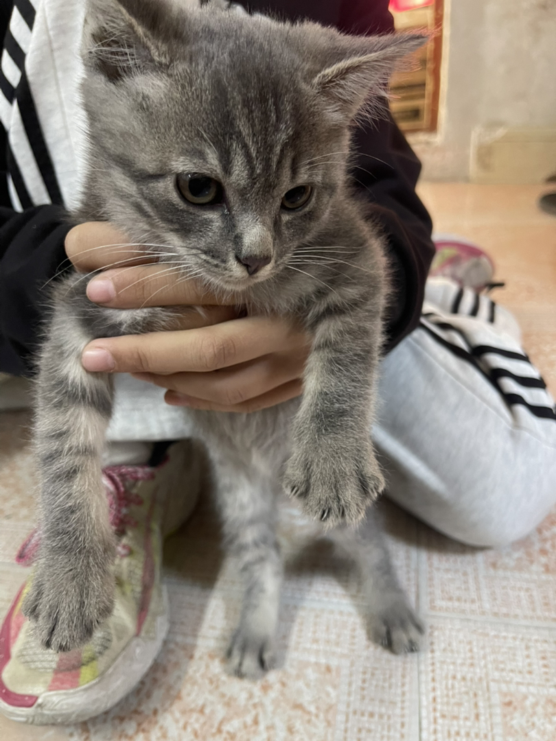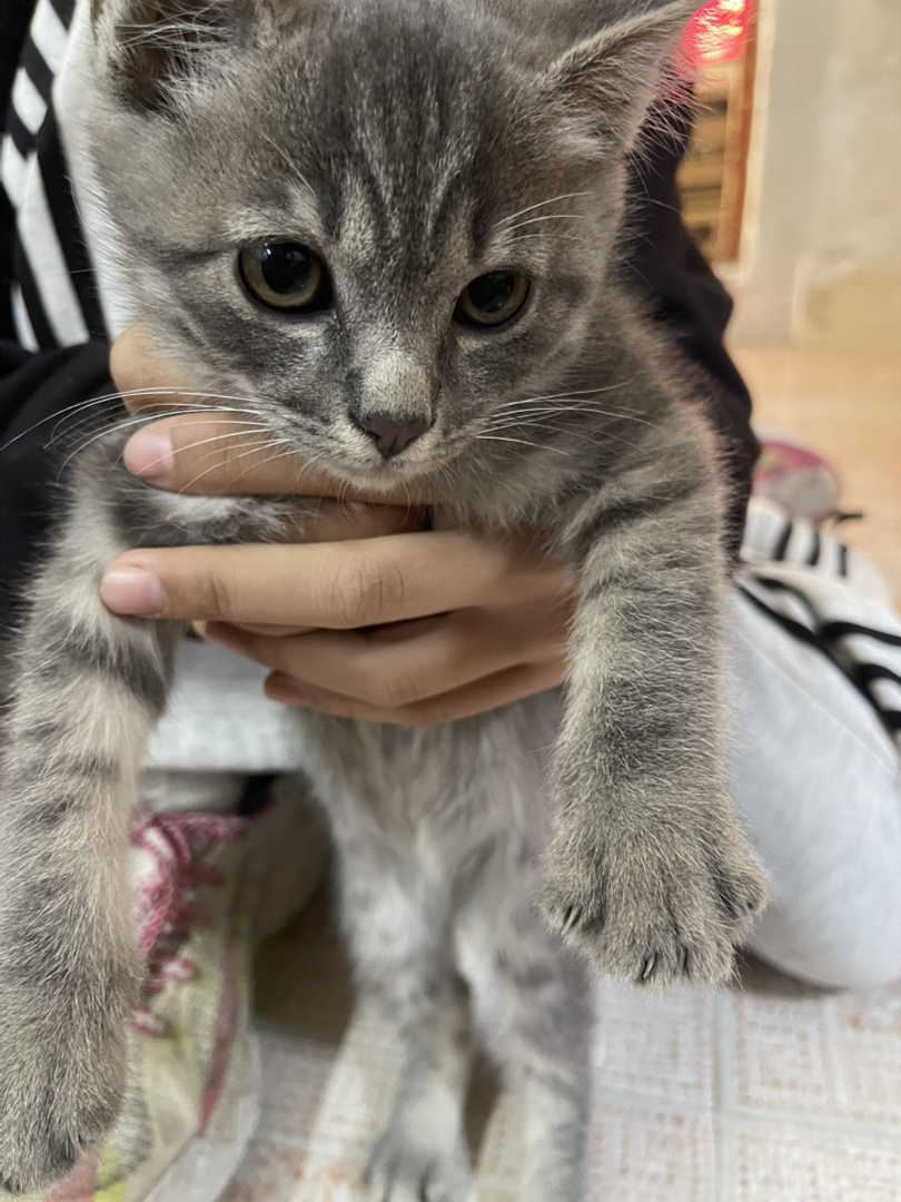 它属于蓝虎斑家猫混血,带有美短/英短血统的中华田园猫混血,毛色细节:灰蓝色底色+深色虎斑纹路,属于“蓝虎斑”配色,这种毛色常见于美短、英短等品种,但它的花纹分布和脸型更偏向家猫(中华田园猫)的混血特征;体型与结构:幼猫阶段的骨架不算特别粗壮,脸型不是纯种美短/英短那样的“包子脸”,更接近田园猫的清秀感,说明是品种猫和家猫的混血;毛发质感:毛发柔软蓬松,但长度偏短,符合短毛猫混血的特征,不是长毛品种的后代。