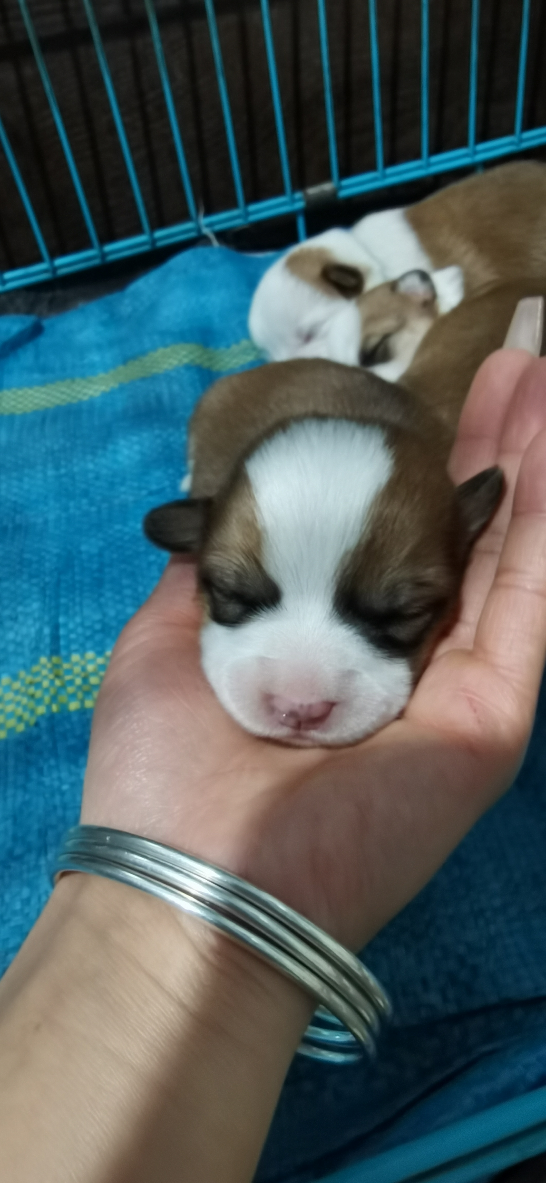 小柯基,老四,只有耳朵是卡其色,奶白色的头,期待长大后的样子😍