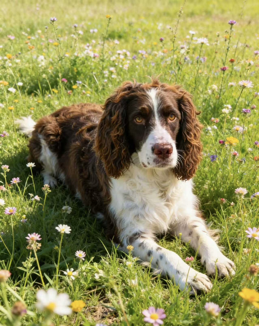 英国史宾格犬,棕白卷毛品相佳,聪明温顺,家庭狩猎好伙伴
