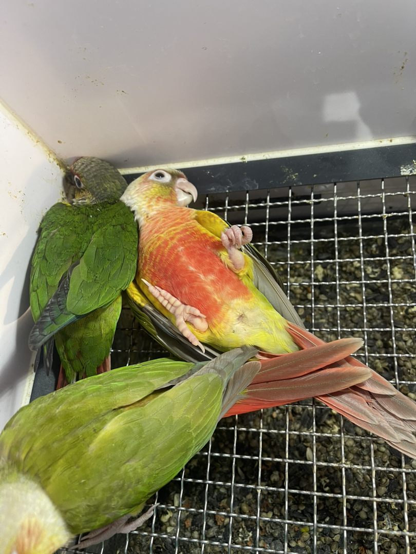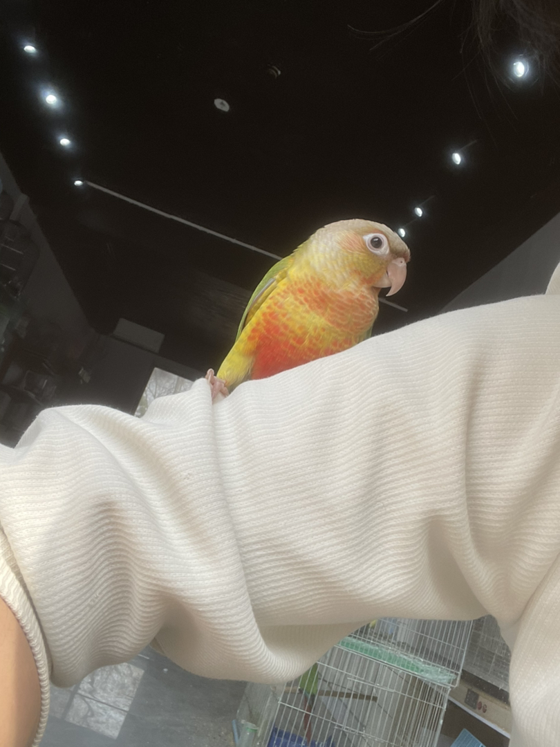 带标识凤梨小太阳鹦鹉,羽色鲜妍,性格亲人互动佳,是理想的手养陪伴型宠鸟