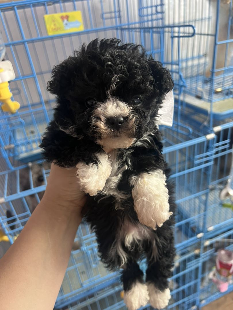 黑白花贵宾幼犬,卷毛蓬松品相佳,活泼粘人,理想陪伴宠物