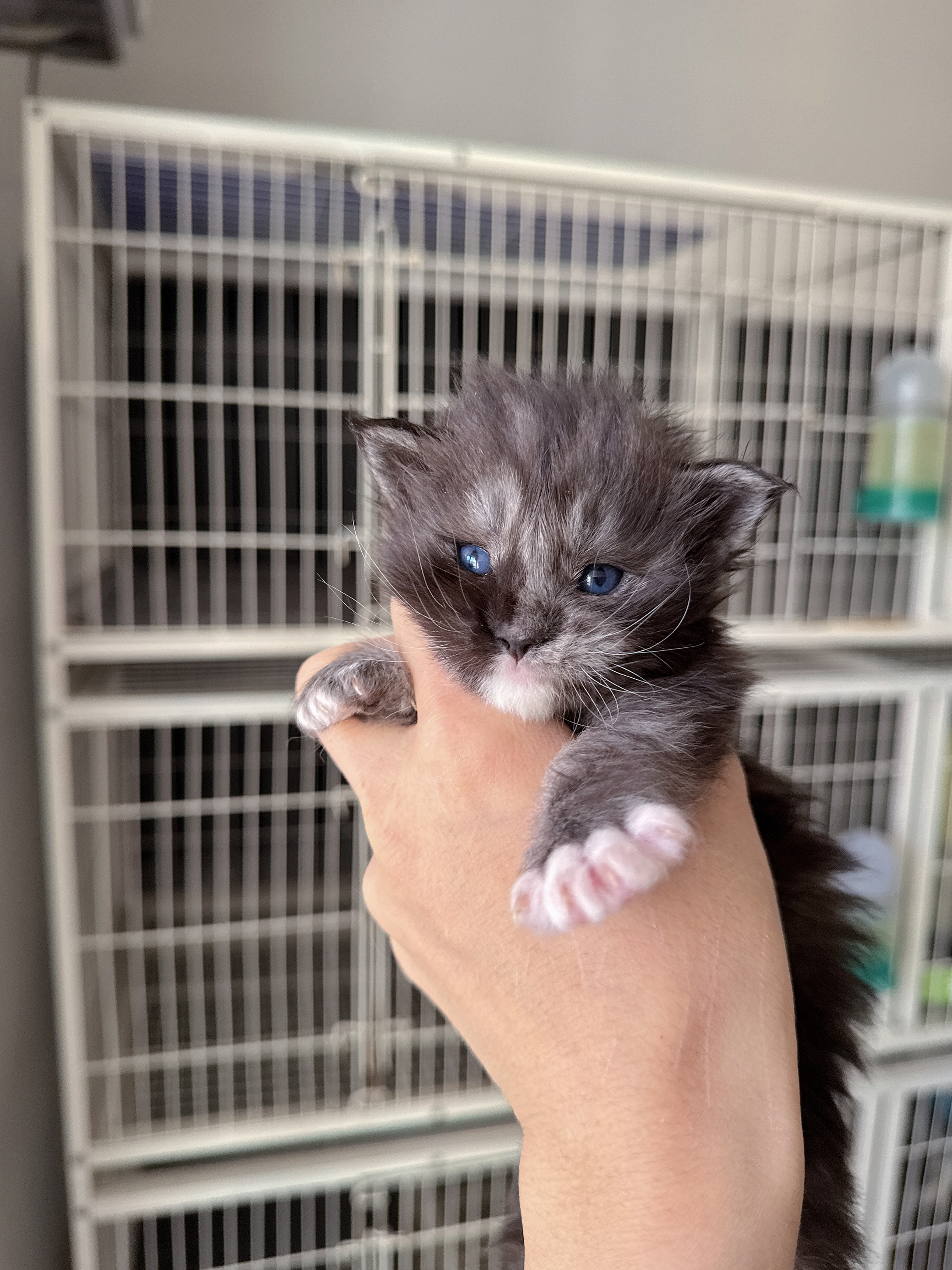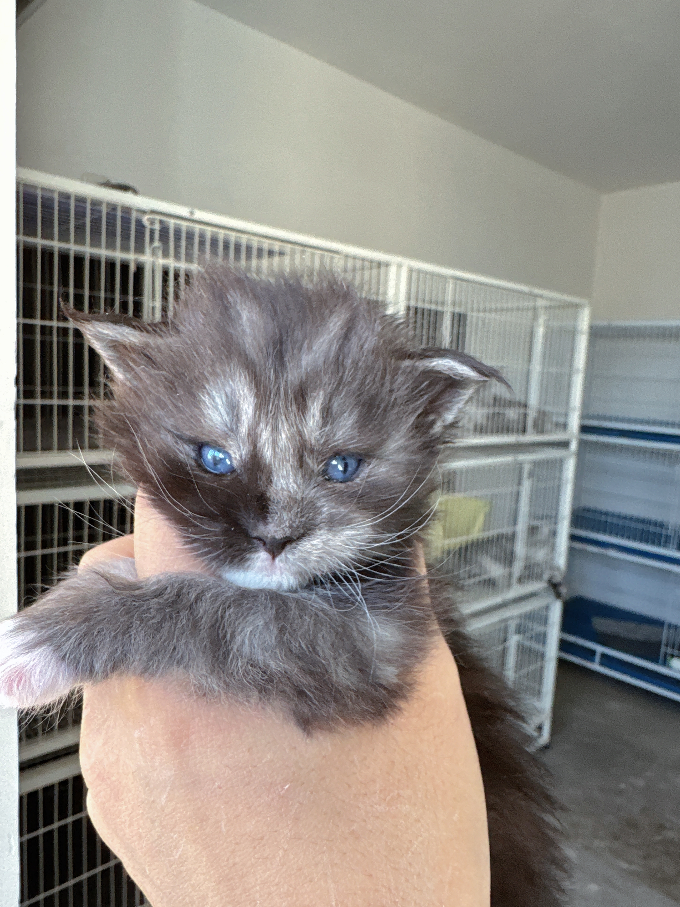 蓝眼烟加白稀有色,毛根银白毛尖烟韵,宝蓝瞳澄澈灵动,品相上乘性格温顺。
